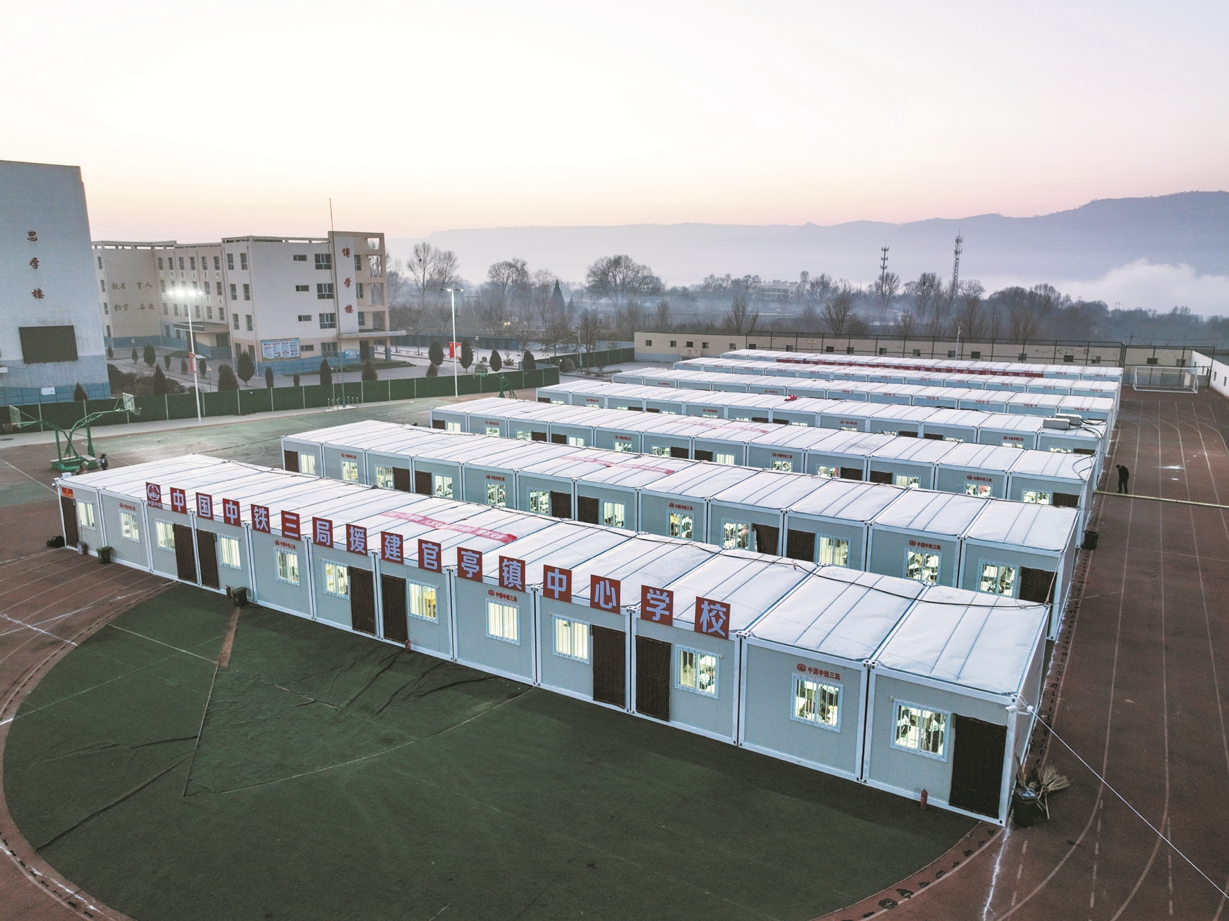 這是1月2日在青海省海東市民和回族土族自治縣官亭鎮(zhèn)中心學(xué)校拍攝的板房教室(無人機(jī)照片)。(新華社發(fā))