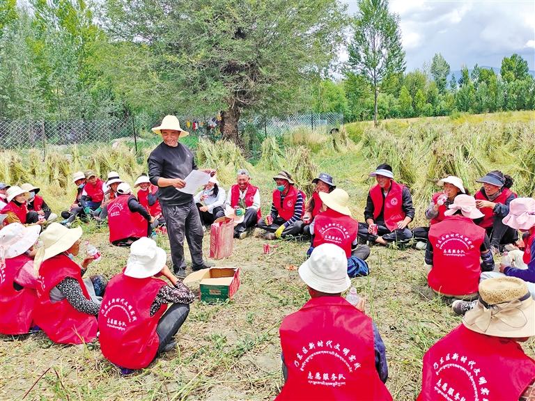 圖為乃東區(qū)新時代文明實(shí)踐志愿服務(wù)隊(duì)在田間地頭學(xué)習(xí)強(qiáng)農(nóng)惠農(nóng)政策。記者 劉楓 攝