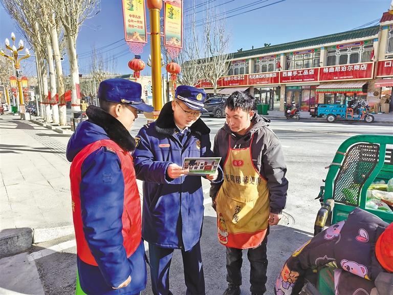 圖為消防宣傳員向沿街商戶科普消防安全知識(shí)。
