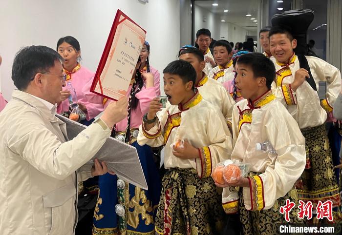 圖為果洛州青少年管樂(lè)團(tuán)的成員們領(lǐng)取獲獎(jiǎng)證書(shū)?!暵?攝