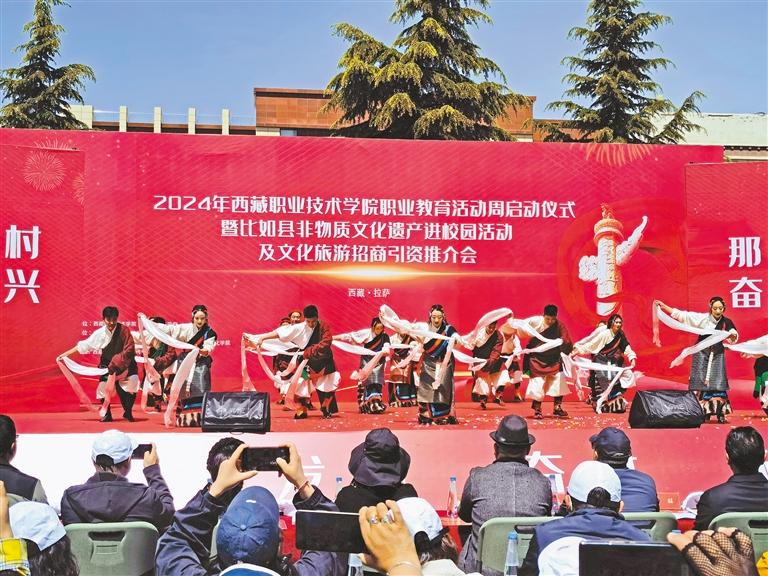 日前,2024年西藏職業(yè)技術(shù)學(xué)院職業(yè)教育活動周在拉薩啟動。那曲市比如縣非物質(zhì)文化遺產(chǎn)走進(jìn)校園,激發(fā)了學(xué)生和老師對傳統(tǒng)文化濃厚的興趣。