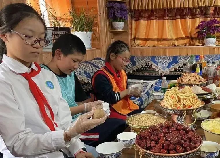 在“藏家”融情交流中,各地少先隊(duì)員在農(nóng)家一起學(xué)習(xí)制作西藏傳統(tǒng)美食糌粑、卡塞等,一個(gè)個(gè)極具創(chuàng)意造型的“小卡塞”,精致巧妙,隊(duì)員們共學(xué)、共樂、共享,體悟藏家民族風(fēng)俗,沉浸在歡樂的氛圍中?!皡⒓哟舜沃黝}隊(duì)會(huì)交流活動(dòng)我非常開心,深度體驗(yàn)了‘藏家’民俗,看到祖國(guó)邊疆鄉(xiāng)村的小康生活,豐富的活動(dòng)讓我增強(qiáng)了對(duì)中華民族優(yōu)秀文化的認(rèn)同感和自豪感,我要繼續(xù)爭(zhēng)做小石榴籽,切實(shí)鑄牢中華民族共同體意識(shí)”來(lái)自重慶市璧山區(qū)劍山實(shí)驗(yàn)小學(xué)五(3)中隊(duì)隊(duì)員李思穎表示。