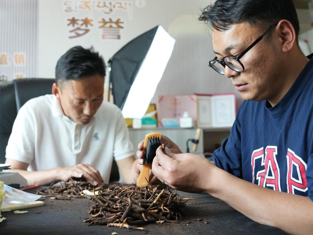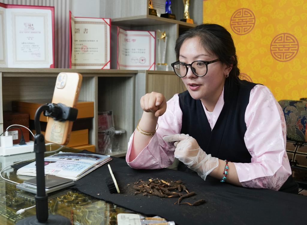 在夢譽(yù)蟲草產(chǎn)業(yè)帶直播基地,羅拉的妻子次仁白吉在直播帶貨(5月31日攝)。新華社記者丁汀 攝