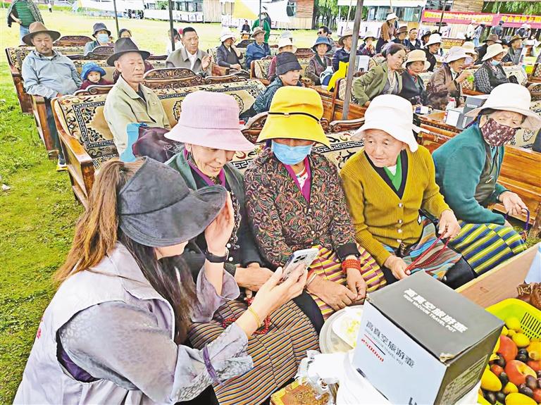 圖為在山南市乃東區(qū)結(jié)莎街道嘎瑪慶社區(qū)聯(lián)合紅星等三個(gè)社區(qū)舉辦的“長(zhǎng)壽宴”活動(dòng)中,工作人員為老人講解如何使用智能手機(jī)。記者 巴桑旺姆 攝