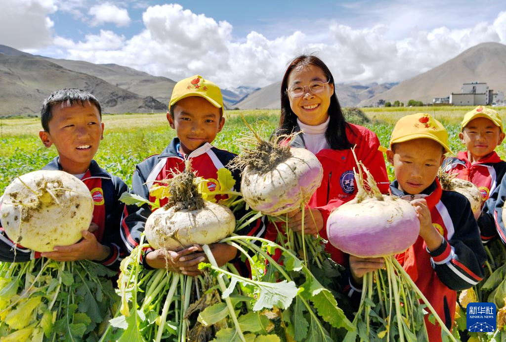 9月5日,在珠峰腳下的田地里,中國科學(xué)院青藏高原研究所副研究員、中國生態(tài)學(xué)學(xué)會高寒生態(tài)專業(yè)委員會委員姜麗麗(中)和學(xué)生們一起展示收獲的蕪菁。新華社記者 張汝鋒 攝
