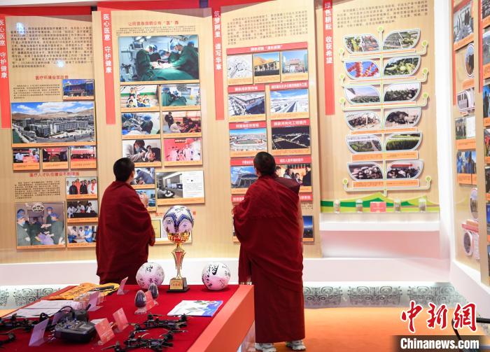 圖為西藏佛學(xué)院僧尼學(xué)員參觀(guān)全國(guó)對(duì)口援藏30周年成就展現(xiàn)場(chǎng)。貢嘎來(lái)松 攝