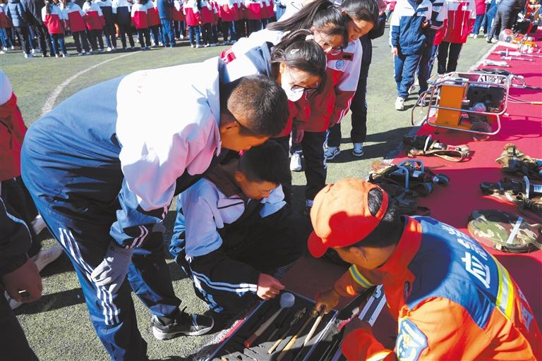 消防員為學(xué)生示范滅火器使用方法。記者 旦增嘎瓦 攝