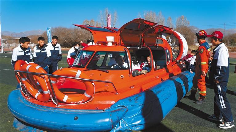 學(xué)生體驗消防救援艇。