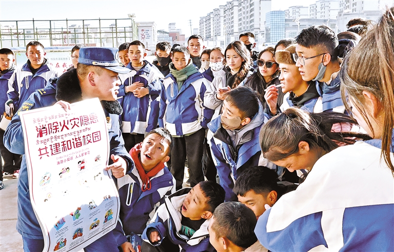 圖為那曲市消防救援支隊(duì)宣講員為師生講解消防安全知識(shí)。記者 王敏 通訊員 蔣貴忠 攝