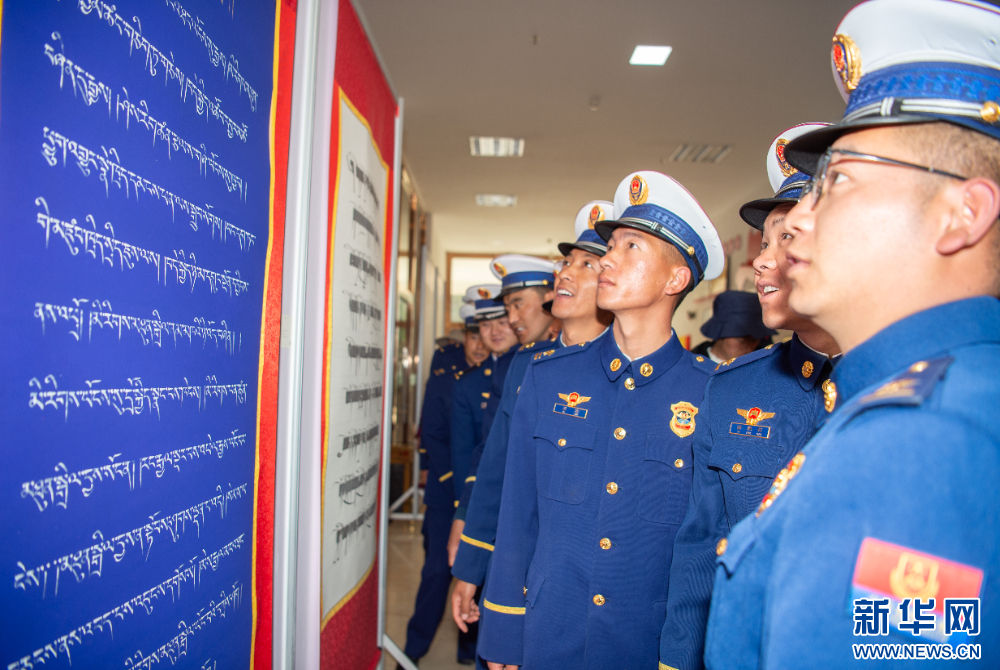 4月9日,西藏森林消防總隊(duì)消防員在西藏自治區(qū)圖書館參觀第五屆“創(chuàng)意與傳承”書法展。新華網(wǎng) 旦增努布 攝