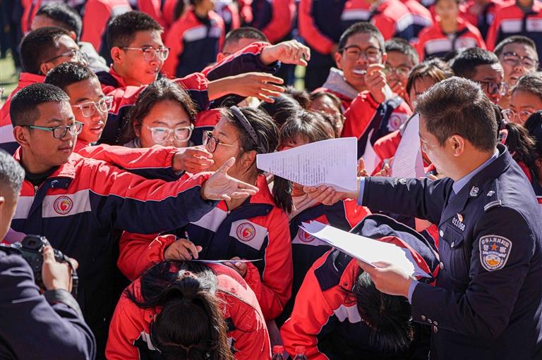 西藏“開學(xué)第一課”網(wǎng)絡(luò)普法進(jìn)校園活動中,民警為學(xué)生發(fā)放普法宣傳知識手冊。記者 貢曲羅杰 攝