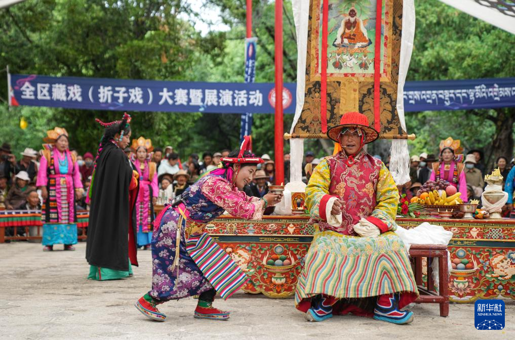 8月8日,山南市洛扎縣曲措藏戲隊(duì)在拉薩羅布林卡表演傳統(tǒng)藏戲《卓瓦桑姆》。新華社記者 晉美多吉 攝 ??