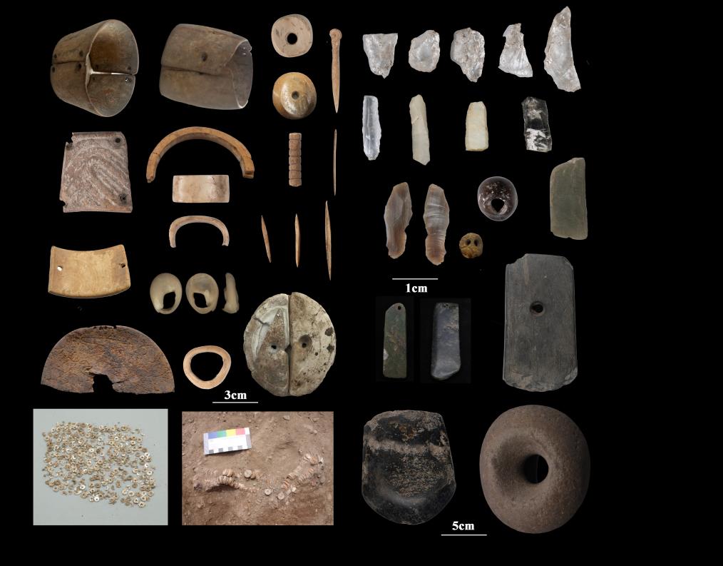 瑪不錯遺址第一期出土遺存典型骨器、石器、蚌器、滑石珠等。(圖片由西藏自治區(qū)文物保護(hù)研究所提供)