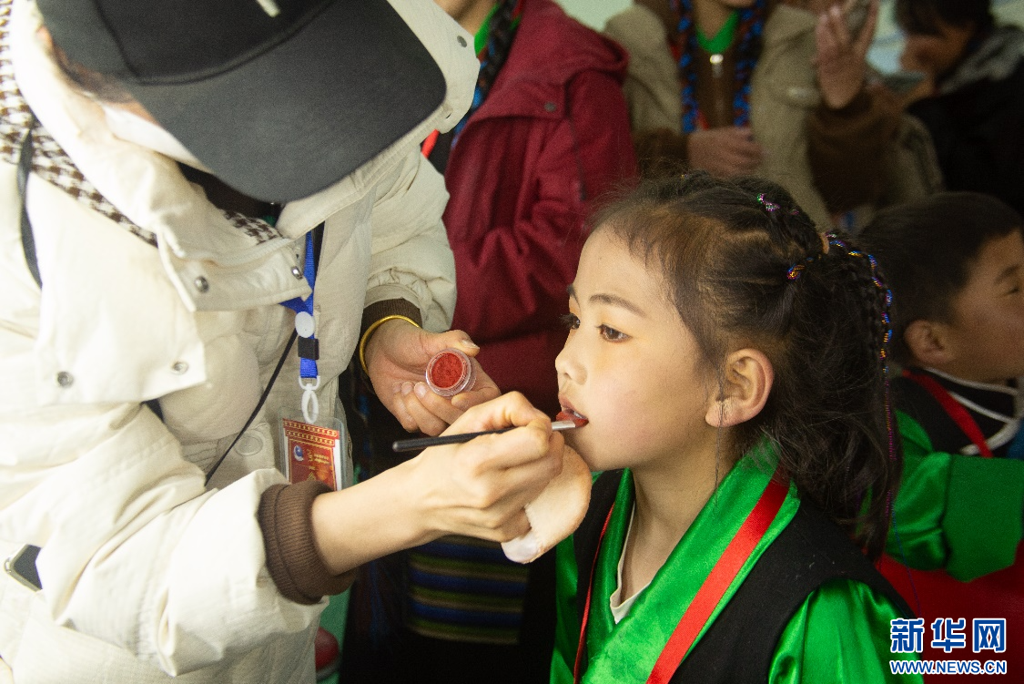 演員次旺拉姆在后臺補妝(2月14日攝)。新華網(wǎng)發(fā) 達瓦拉姆 攝