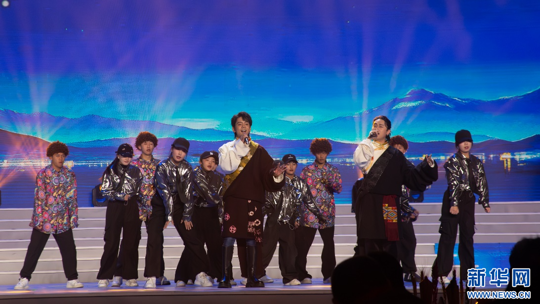 丁真、宮巴在演唱歌曲《喜馬拉雅的孩子》(2月14日攝)。新華網(wǎng)發(fā) 龍杰明 攝??
