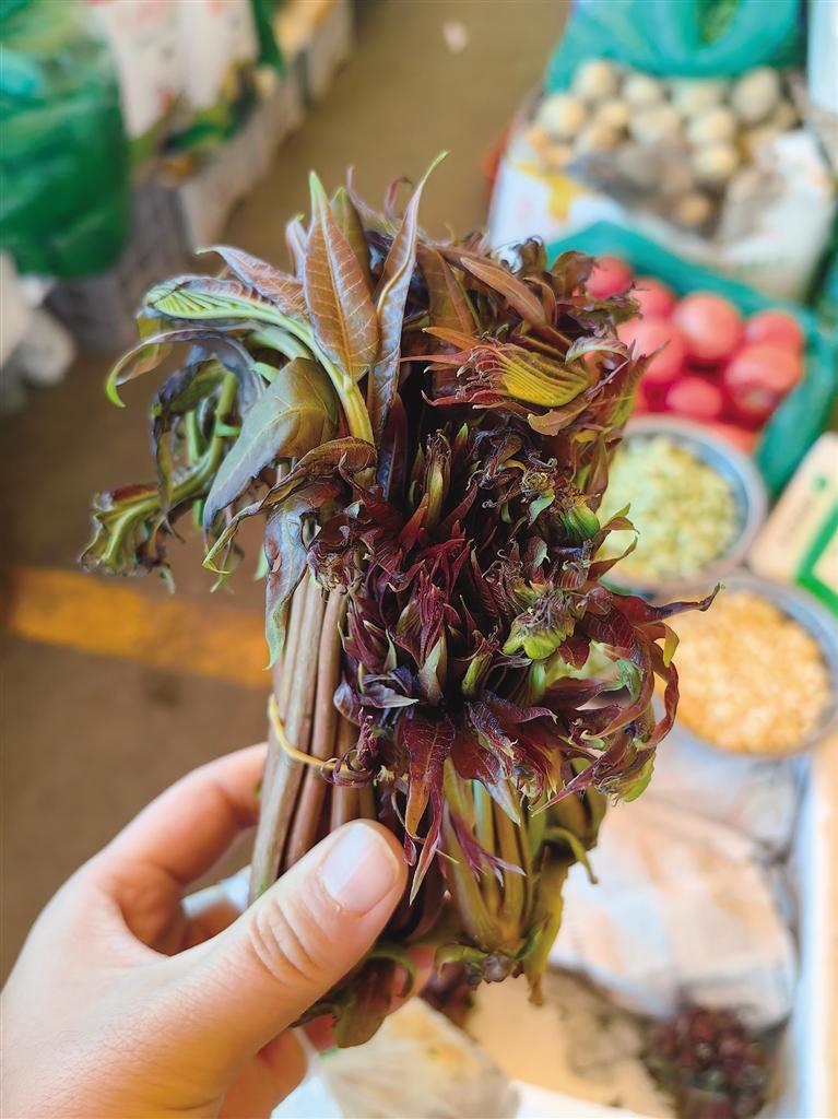 香椿芽堪稱是“春天的珍饈”,素有樹上蔬菜的美稱?!拔业睦霞以诤颖?,每年春天香椿冒芽的時候,都會采摘香椿芽炒著吃,甚至吃不完的香椿芽還會用來做成香椿醬。”張女士說,在菜市場,她看到紫紅色的香椿葉,散發(fā)出獨特的香氣,立馬想買一點回家炒雞蛋吃。