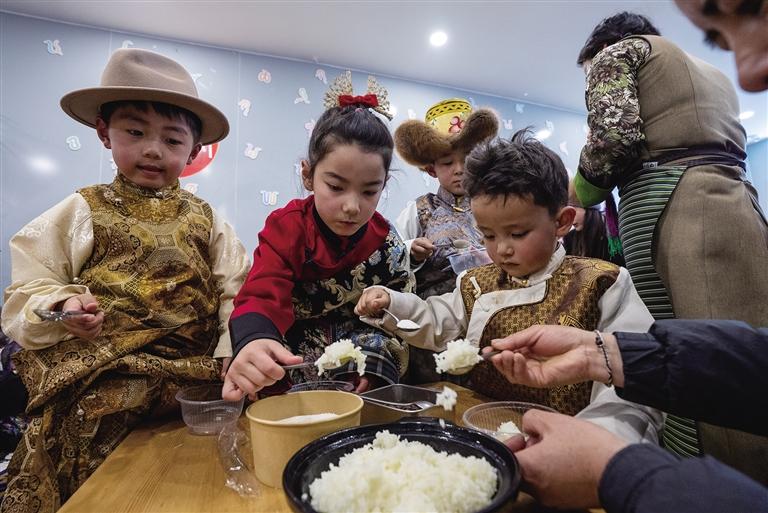 諾諾兒童藏裝派對上,孩子們正在制作人參果酥油飯。