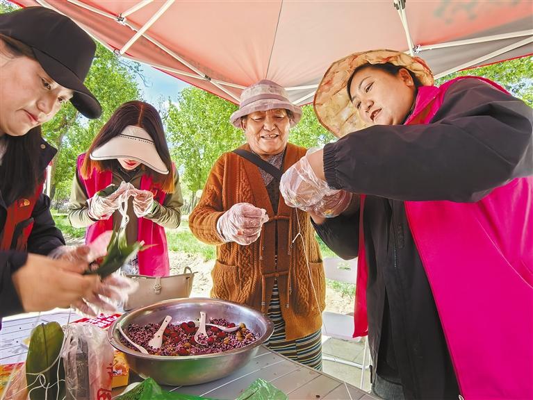 5月29日,日喀則市舉行喜迎西藏自治區(qū)成立60周年暨“我們的節(jié)日·端午”主題活動(dòng),以節(jié)日為媒,將鑄牢中華民族共同體意識(shí)宣傳教育融入傳統(tǒng)節(jié)慶?;顒?dòng)中,自治區(qū)十佳宣講員平措用通俗易懂的語(yǔ)言,為現(xiàn)場(chǎng)市民群眾講述端午節(jié)的由來(lái)和美食、習(xí)俗等小知識(shí);志愿者們聲情并茂地誦讀《端午詠屈原》、《端午情懷》、《屈子頌》等經(jīng)典作品,贏得陣陣掌聲。市民群眾興致勃勃地參與旱地龍舟趣味小游戲、端午節(jié)知識(shí)有獎(jiǎng)競(jìng)答,包粽子、制香囊,在歡聲笑語(yǔ)中感受傳統(tǒng)文化的魅力。在定結(jié)縣扎西崗鄉(xiāng),災(zāi)后重建施工隊(duì)和村民代表歡聚一堂,頓珠次仁等群眾自發(fā)彈起扎念琴,施工隊(duì)代表也上臺(tái)傾情獻(xiàn)唱,其樂(lè)融融。在薩迦縣新時(shí)代文明實(shí)踐中心,歌舞、戲曲、小品等節(jié)目輪番上演,讓縣特困供養(yǎng)中心老人們享受到了一場(chǎng)視聽(tīng)盛宴。