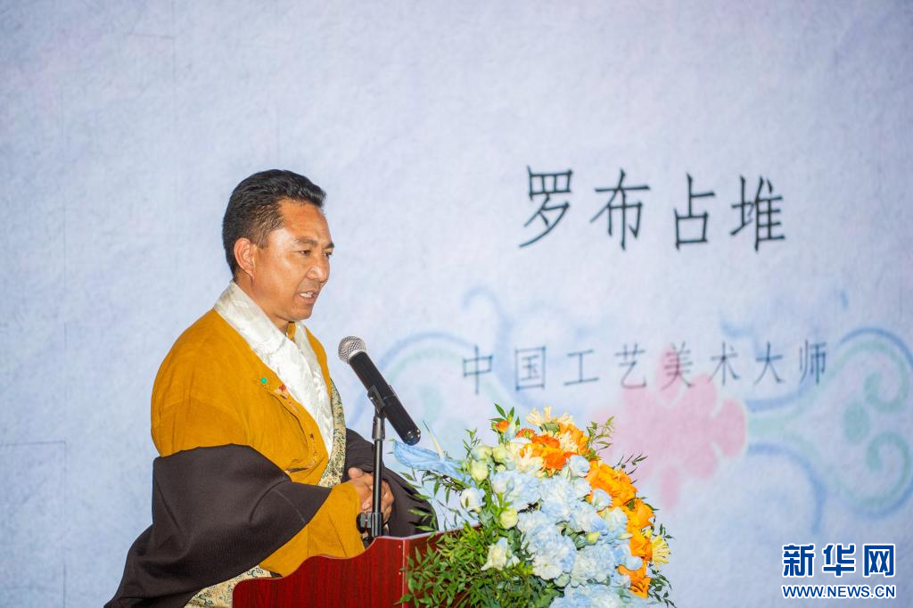 7月7日,中國工藝美術大師羅布占堆在活動現(xiàn)場交流發(fā)言。新華網(wǎng) 旦增努布 攝