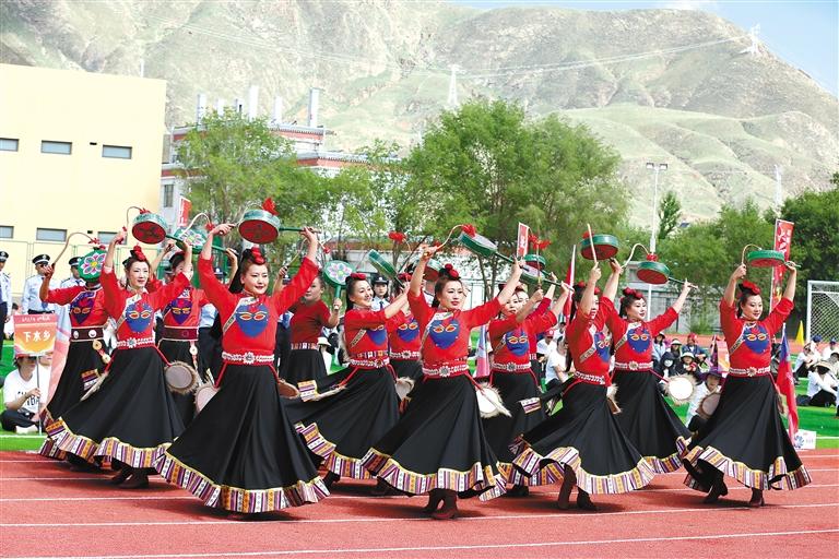 圖為鄉(xiāng)鎮(zhèn)代表隊身著民族服裝出場,并在行進(jìn)中表演節(jié)目。記者 丹增群培 通訊員 倫珠澤仁 攝