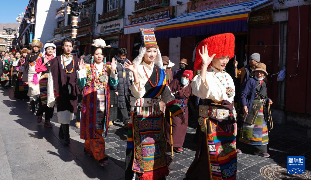 模特在拉薩八廓街“繁飾自然·衣彩拉薩——拉薩新年服飾秀”活動(dòng)中巡游(2025年1月3日攝)。新華社記者 晉美多吉 攝