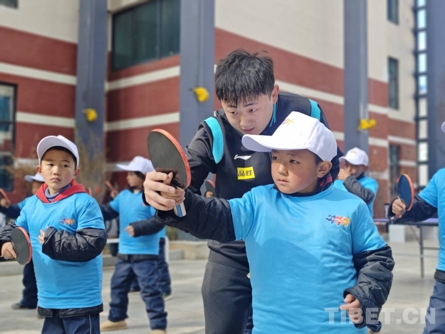 學(xué)生在老師的指導(dǎo)下練習(xí)乒乓球揮拍