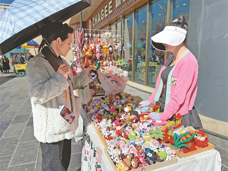 4月初,拉薩天海國際廣場的街頭,一輛擺滿鉤織好物的小推車總引得行人駐足。軟萌的玩偶、實用的杯墊、精致的酥油茶杯套……件件手作皆藏匠心,攤主林楊陽和她的學員,便是這些指尖好物的創(chuàng)造者。