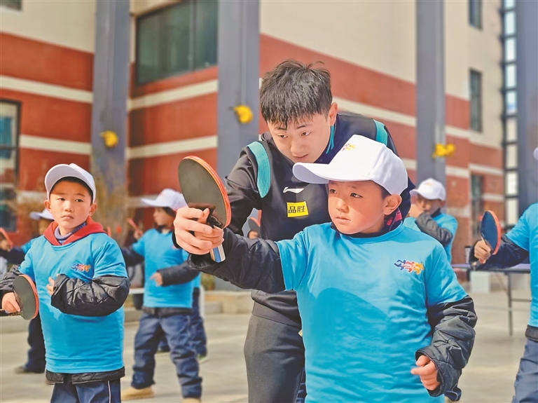 學(xué)生在教練員的指導(dǎo)下練習(xí)乒乓球揮拍動作。