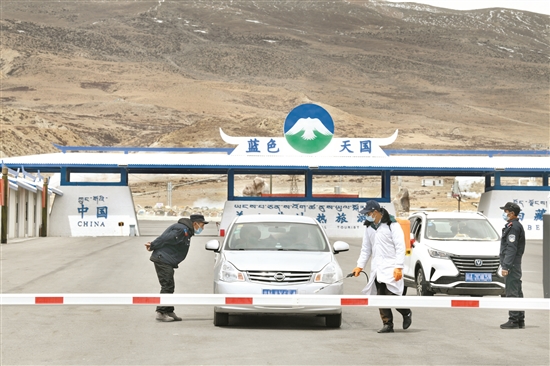 為當(dāng)雄縣羊八井藍(lán)色天國對進(jìn)出車輛進(jìn)行消毒安檢。(本組圖片由拉薩融媒視覺組攝)