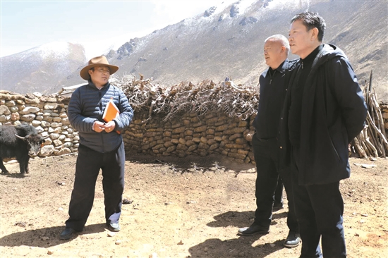 4月14日至15日,區(qū)黨委常委、拉薩市委書(shū)記白瑪旺堆深入林周縣開(kāi)展脫貧攻堅(jiān)調(diào)研督戰(zhàn)工作。圖為白瑪旺堆來(lái)到林周縣旁多鄉(xiāng)達(dá)龍村,向村里工作人員了解村民脫貧增收、牦牛養(yǎng)殖等情況。