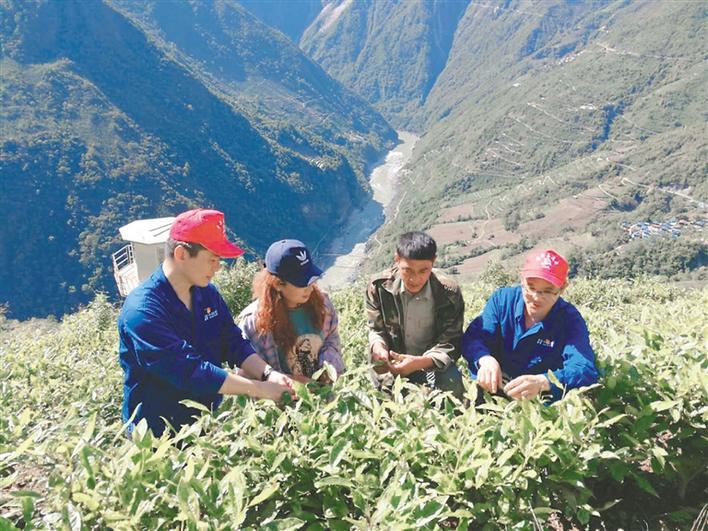 圖為華能雅江公司駐村干部與當(dāng)?shù)匕傩找黄鸩榭床枞~長(zhǎng)勢(shì)。記者 楊小娟 攝