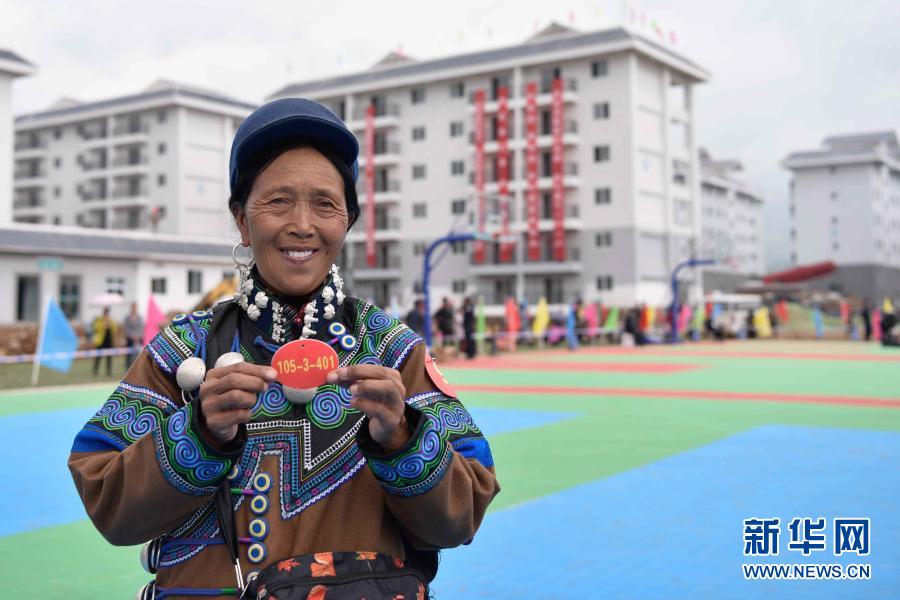 在布拖縣依撒社區(qū)安置點(diǎn)抽簽分房現(xiàn)場,56歲的阿比么日扎展示自己抽中的新家房號(hào)(6月21日攝)。新華社記者 胥冰潔 攝