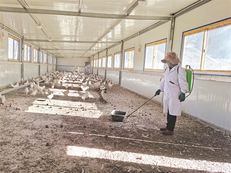 圖為工作人員正在給雞舍消毒。 拉薩融媒記者 范江英攝