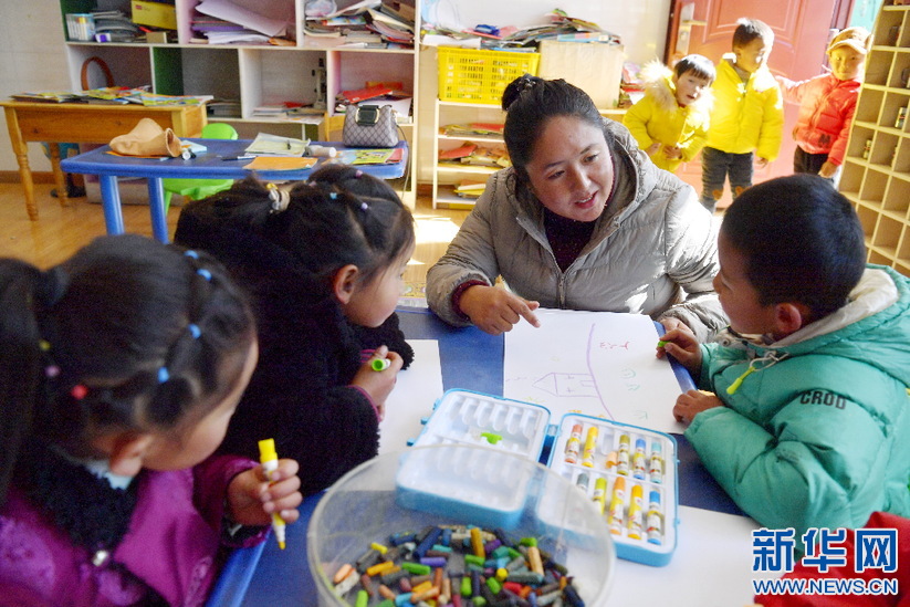 在西藏山南市貢嘎縣吉雄鎮(zhèn)紅星社區(qū)雙語幼兒園,老師次央(左三)指導(dǎo)孩子們繪畫(11月25日攝)。新華社記者 張汝鋒 攝