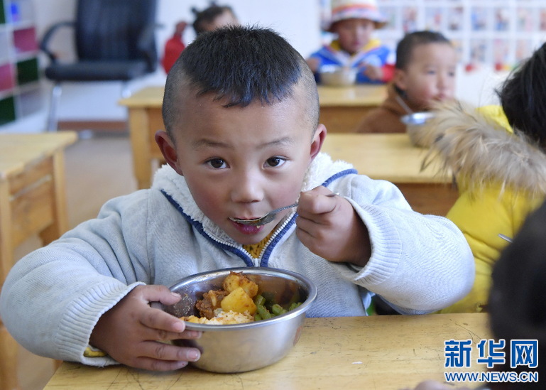 西藏山南市貢嘎縣吉雄鎮(zhèn)紅星社區(qū)雙語幼兒園的孩子們吃午餐(11月25日攝)。新華社記者 張汝鋒 攝