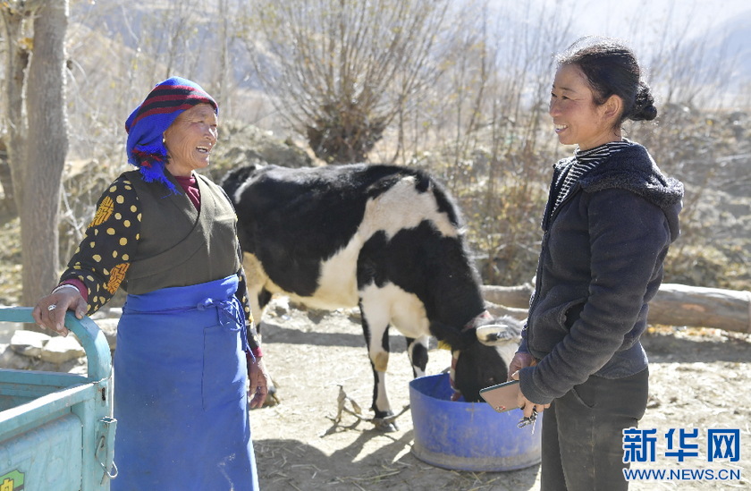 西藏山南市貢嘎縣吉雄鎮(zhèn)紅星社區(qū)居民玉珍(右)和鄰居卓瑪嘎日在院子外聊天(11月25日攝)。新華社記者 張汝鋒 攝