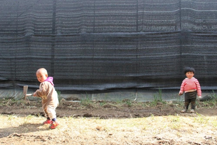 圖為村中小孩在靈芝種植大棚一隅悠閑地吃著零食