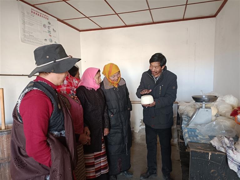 馬村草場遼闊,有著養(yǎng)殖犏牛等牲畜的良好自然條件。以前該村由于一直依靠傳統(tǒng)方式養(yǎng)牛,規(guī)模小、科技含量低、品種老化、產業(yè)帶動力不明顯,一直處于“家家養(yǎng)牛家家窮”的狀態(tài)。2013年,在拉薩市委組織部(駐村工作隊)的幫扶下,投入90萬元成立了堆龍德慶區(qū)馬鎮(zhèn)馬村平措犏牛養(yǎng)殖合作社。接下來的幾年不斷擴大養(yǎng)殖規(guī)模和提高養(yǎng)殖經營水平,建成了馬村高原特色犏牛養(yǎng)殖及乳制品加工銷售一體化養(yǎng)殖基地,其乳制品深受市場的歡迎。目前,合作社有犏牛100多頭,帶動5人就業(yè),2019年起除了與其他村集體經濟收入一起給常住戶分紅外,每年向本村建檔立卡貧困戶分紅?!拔覀兇褰涍^發(fā)展,成立了犏牛養(yǎng)殖合作社,合作社的收入一年比一年好。今年,村集體經濟為我們脫貧戶每戶分紅2900元,我們特別開心。今后也希望能更多地參與到村集體發(fā)展中,學好技術,讓家庭條件越來越好?!贝迕衤迳8吲d地說。