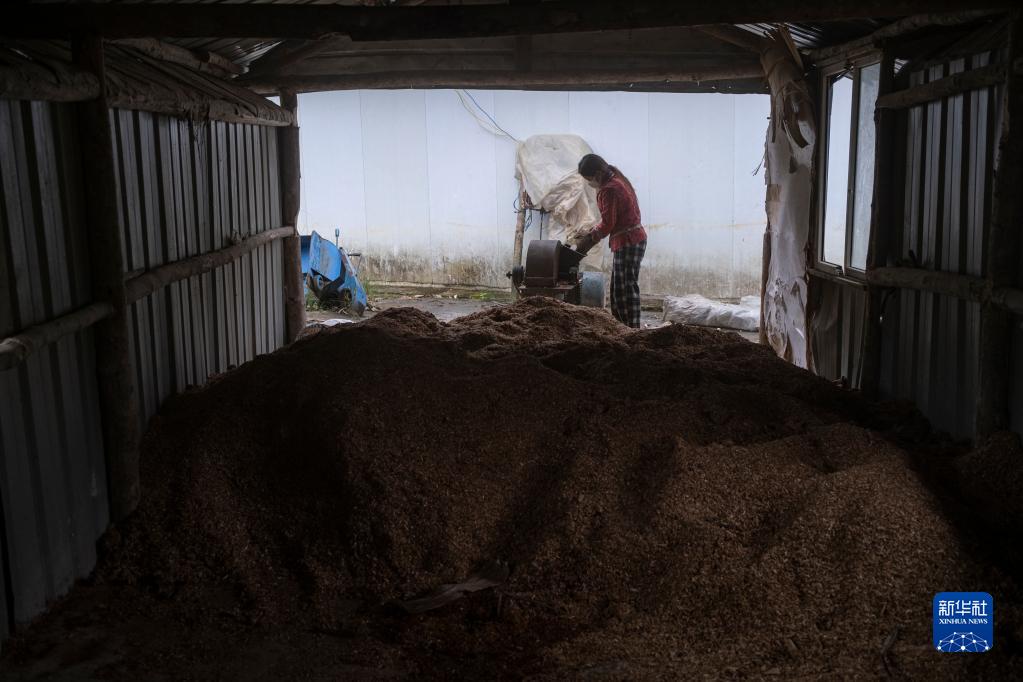 明珠措姆在碾碎玉米芯,準(zhǔn)備制作菌棒(4月14日攝)。