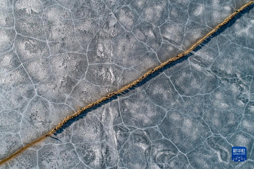 羊群順著安全小路通過(guò)普莫雍錯(cuò)冰湖。新華社記者 孫瑞博 攝