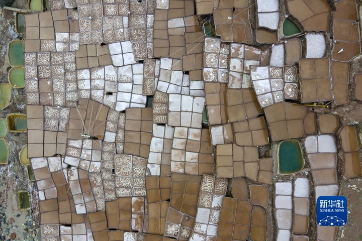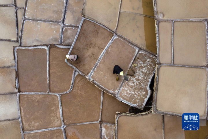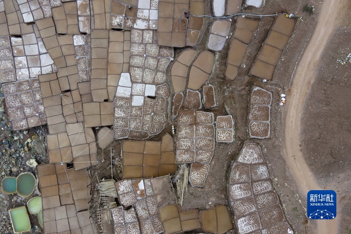 加達(dá)村村民在古鹽田里勞作(無人機照片,5月26日攝)。新華社記者 周荻瀟 攝