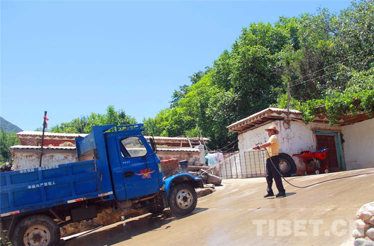 圖為丁增拉姆的父親在沖洗家里的農用汽車 攝影:王茜