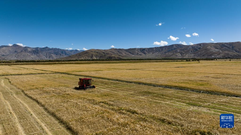 西藏日喀則市江孜縣熱索鄉(xiāng)努康村農(nóng)機(jī)合作社村民正在集中對村里三千多畝耕地進(jìn)行機(jī)械化收割(9月19日攝)。