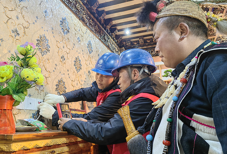 藏歷新年前,供電所服務班長索朗吾珠、班員云丹正在檢查家庭旅館的電源開關(2月19日攝)。國網西藏電力供圖 陶丹丹 攝