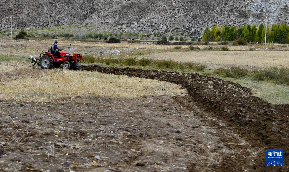 西藏拉薩市達(dá)孜區(qū)德慶鎮(zhèn)白納村村民駕駛小型拖拉機(jī)犁地(10月11日攝)。新華社記者 張汝鋒 攝