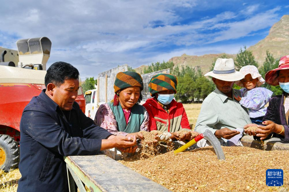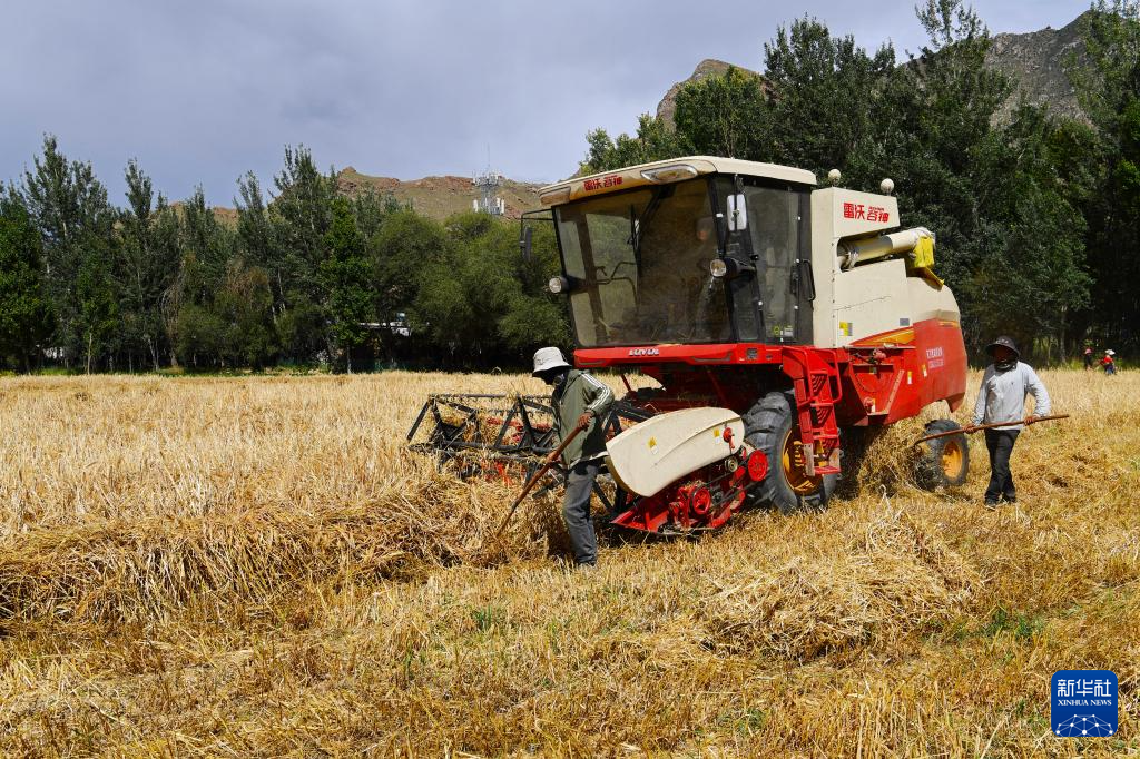 西藏曲水縣才納鄉(xiāng)白堆村村民在高標(biāo)準(zhǔn)化農(nóng)田內(nèi)收獲青稞(9月11日攝)。新華社記者 張汝鋒 攝