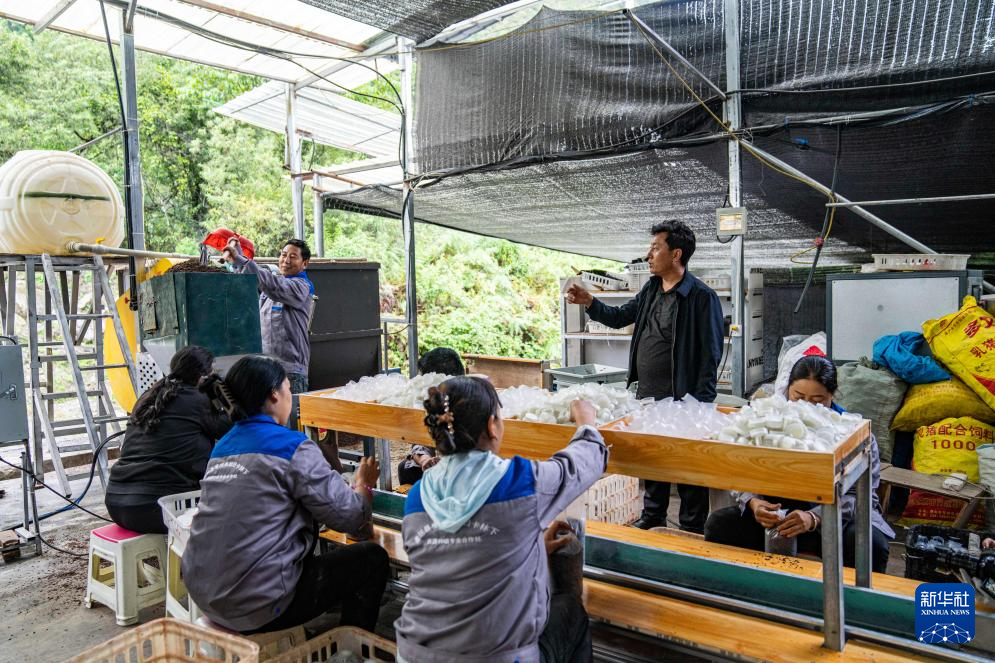 在墨脫縣格當(dāng)鄉(xiāng)尼日卡林下資源種植合作社,貢秋次仁(右二)指揮工人生產(chǎn)菌包(2023年10月12日攝)。新華社記者 孫非 攝