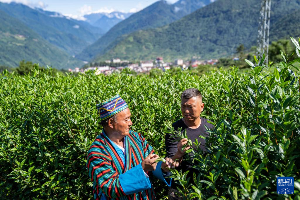 墨脫村村委會副主任達瓦次仁(右)查看茶葉生長情況(2023年10月13日攝)。新華社記者 孫非 攝