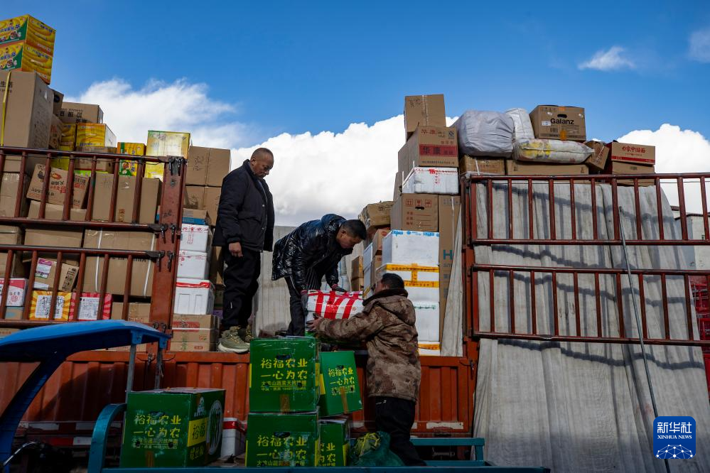申扎縣供銷合作社的配送員次仁桑珠在縣城總店為馬躍鄉(xiāng)貝嘎四村偏遠(yuǎn)鄉(xiāng)鎮(zhèn)果蔬配送試點(diǎn)項(xiàng)目直銷點(diǎn)上貨(1月5日攝)。新華社記者 曹檳 攝