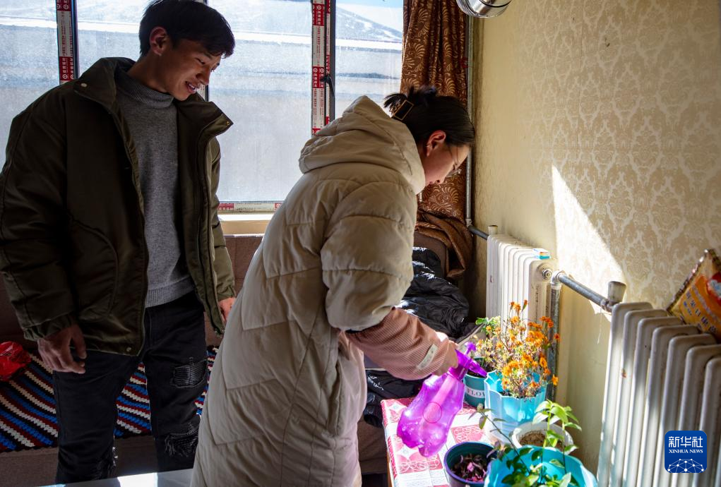 距離太陽能集熱場(chǎng)約3公里外的縣職工周轉(zhuǎn)房小區(qū)是供暖工程的最遠(yuǎn)端,年輕夫妻曲珠(左)和央次仁在家中侍弄花草(1月6日攝)。新華社記者 姜帆 攝